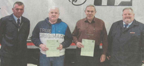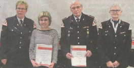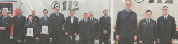 Das Foto (oben l.) zeigt Andrea Bergens und Jannis Winter (Beförderung zum Oberlöschmeister), Sven Daniel (hintere Reihe, 3 v. l./Anerkennungsprämie) sowie (v. r.) Niclas Nern, Markus Mohr, Sebastian Nitsche, Sascha Huber, Moritz Otto und Andreas Litwin (l.) und Wehrführer Jörg Winter. Neu gewählte Vorstandsmitglieder sind (oben r., v. l.) Nico Diehl (Kassenwart), Andrea Bergens (zweite Schriftführerin) und Vorsitzenden Steffen Häuser. Das Foto der Ehrung zeigt (unten l., v. l.) stellvertretenden Vorsitzenden Jörg Winter, Rainer Dämon (25 Jahre passiv), Jürgen Rühl (50 Jahre passiv) und Markus Mohr. Das Foto der Ehrung der Musiker (unten r.) Sabine Lex, Franziska Müller, Erwin Reinhard und Heidrun Diehl.
