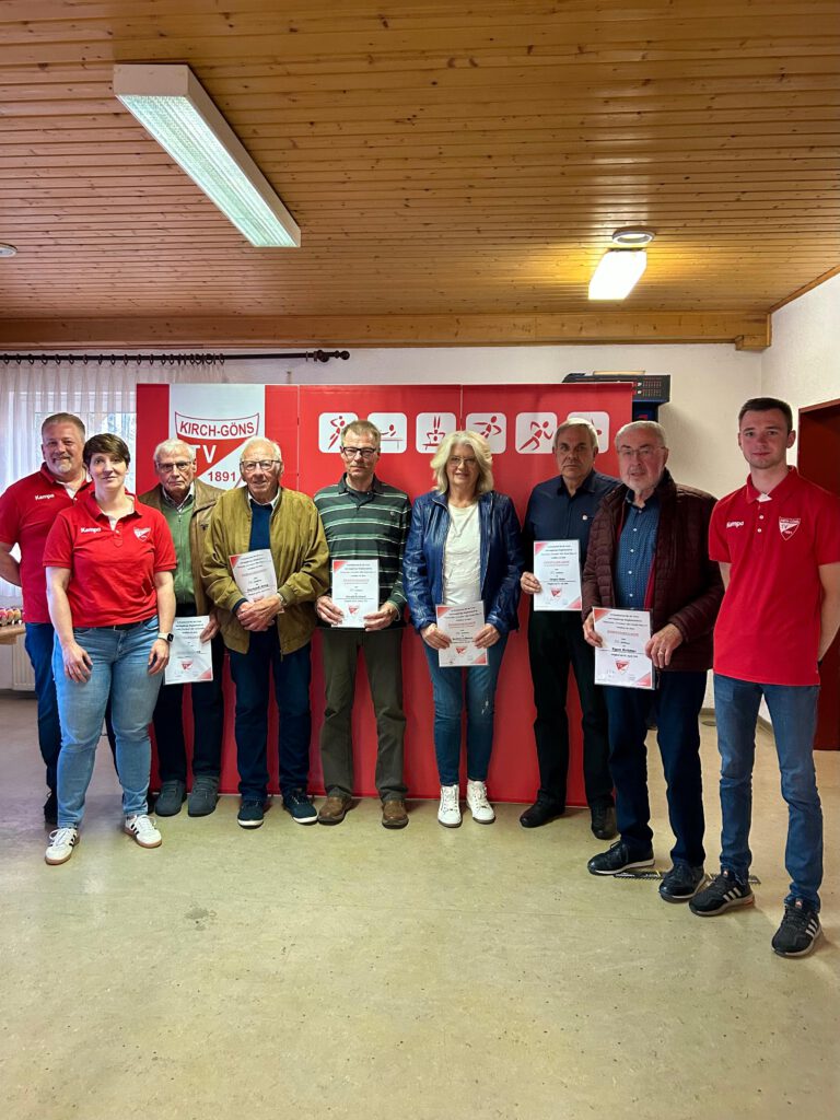 Ehrungen zur Jahreshauptversammlung beim TV Kirch-Göns. V. l. Thorsten Metz (1. Vorsitzender), Kristina Euler, Erwin Reinhard, Gerhard Jung, Harald Eckhard, Bettina Löbrich, Jürgen Rühl, Egon Krämer und Felix Maiwald (kommissarisch 2. Vorsitzender).