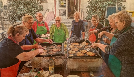 Im Zeichen der Kartoffeln hat jüngst der Miteinander-Mittagstisch (MiMit) im Bürgerhaus Kirch-Göns gestanden. Das Team der evangelischen Kirchengemeinde hatte ein herbstliches Menü auf die Agenda gesetzt. Das Mittagessen startete mit einer Kartoffel-Gemüse-Suppe, die selbst zubereitet war – wie alles an diesem Tag. Größtenteils wurden lokale Erzeugnisse verwendet: Kartoffeln, Äpfel und Eier aus dem Dorf. Während die Gäste sich auf die Vorspeise konzentrierten, brutzelten die Kartoffelpuffer in den Pfannen vor dem Bürgerhaus. Hier hatte man einen Grillstand als „Pannekuche-Küch“ aufgestellt. Dort bereiteten die Mi-Mit-Damen knusprige Kartoffelpuffer zu. Serviert wurden sie mit dem am Vortag gemachten Apfelmus. Als Dessert gab es Obstbrände. Diese waren nicht von Äpfeln, sondern Birnen sowie Mariellen und vom MiMit-Getränkelieferanten Köhler aus Oberkleen gespendet. Ein Tag voller Genuss, Herbststimmung und gemütlicher Gesellschaft.