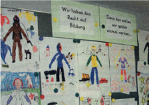 Zum gestrigen Weltkindertag sangen die Schüler der Gönser Grundschule auf dem Schulhof das passende Lied über Kinderrechte. Über diese Rechte informiert auch eine Ausstellung im Foyer der Schule, unter anderem über das Recht auf Bildung mit einer Zusammenstellung, was die Kinder einmal werden möchten.