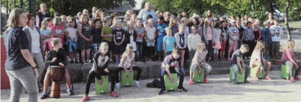 Auf einer Stellwand mit vielen kleinen Koffern beschäftigten sie sich mit der Frage: Wenn ich flüchten müsste, welche eine Sache würde ich mitnehmen? Der Vorsitzende des Fördervereins Stephan Steiner, überreichte für jede Klasse eine Informationsbox zum Sammeln und Aufbewahren der zukünftigen Materialien. Sie enthielten bereits je ein Buch zum Thema und dazu eine kleine Broschüre für jedes Kind. Großer Abschluss war das gemeinsam auf dem Schulhof angestimmte „Kinderrechte-Lied“. Als Bonus für die Kinder verlängerte die Schulleiterin die große Pause um zehn Minuten.
