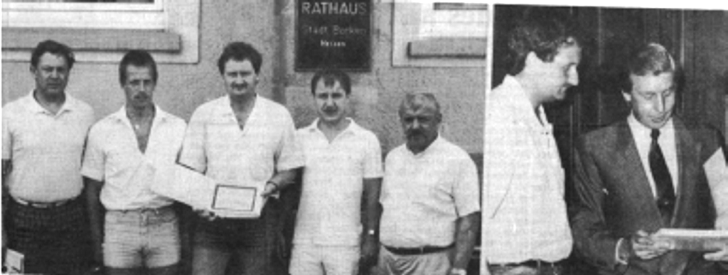 Mit einer Geldspende von über 1 000 DM, die als Reinerlös bei einem Straßenfest in der Taubgasse zustande kam, leisteten am Sonntag fünf Kirch-Gönser Bürger einen wertvollen Beitrag zur Unterstützung der Angehörigen der Bergwerkskatastrophe von wenigen Wochen. Gerd Häuser, Thilo Lauer, Hans-Jürgen Nern, Bernd Zahn und Heinz Quack (linkes Bild v. l.) überreichten die Summe anlässlich eines Empfangs der Stadtverwaltung an den Borkener Bürgermeister Heßler (Bild rechts). Wie Hans-Jürgen Nern als Sprecher der Kirch-Gönser aus der Taubgasse erklärte, entschlossen sich die Straßenfestorganisatoren spontan dazu, den Überschuss ihres sehr gut besuchten Festes als Beitrag zur Milderung der Not der nach dem Unglück ohne Ernährer dastehenden Bergarbeiterfamilien zu spenden. In Borken wurde diese Geste, so Bürgermeister Heßler und die beiden Direktoren des Bergwerkvereins, mit „viel Dankbarkeit und Sympathie“ entgegengenommen. Nach Einer Besichtigung des Unfallortes wurden die fünf Kirch-Gönser anschließend noch von Vertretern der Preussag als der Bergwerksbetreiberin zu einem gemeinsamen Essen eingeladen.