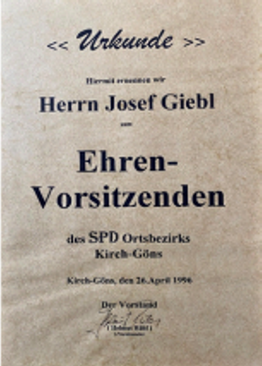 Am 26.April 1996 wurde Josef Giebl vom SPD Ortsbezirk Kirch-Göns zum Ehrenvorsitzenden