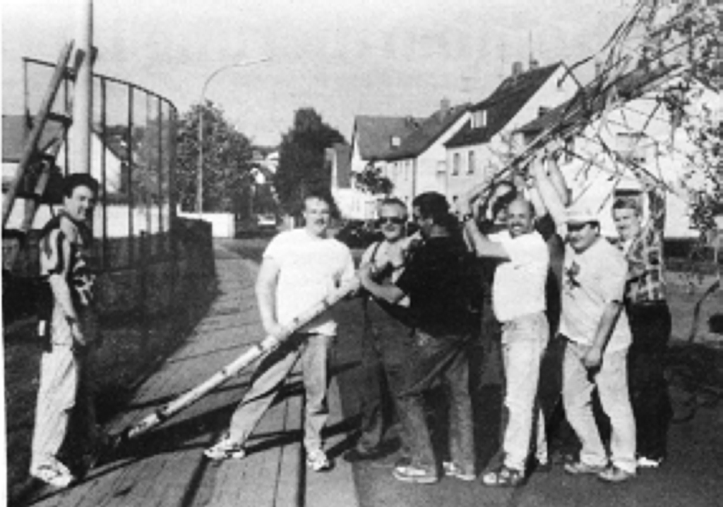Der Kegelclub Goldene Neun beim Maibaum-Aufstellen. V. .l.: Jürgen Häuser, Rainer Dämon, Werner Dämon, Rolf Myroniuk, Harold Jack, Dieter Daniel, Eckhard Röhrig und Gernot Gärtner. Das Bild entstand in der Bahnhofstraße in Kirch-Göns (Sport-platzgelände).