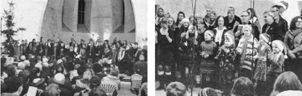 Ein Publikumsmagnet war das Weihnachtskonzert in der früheren amerikanischen Kirche im Magna Park. Das obere Foto zeigt die Sängerinnen und Sänger des Gesangvereins 1862 Kirch-Göns, den gemischten Chor und den Gospelchor „Let it shine“ zusammen mit Florian Ilge am Klavier. Rechts oben der Kinderchor, links unten die beiden Moderatoren Theresa Heinz und Claudia Binzer. Quelle: