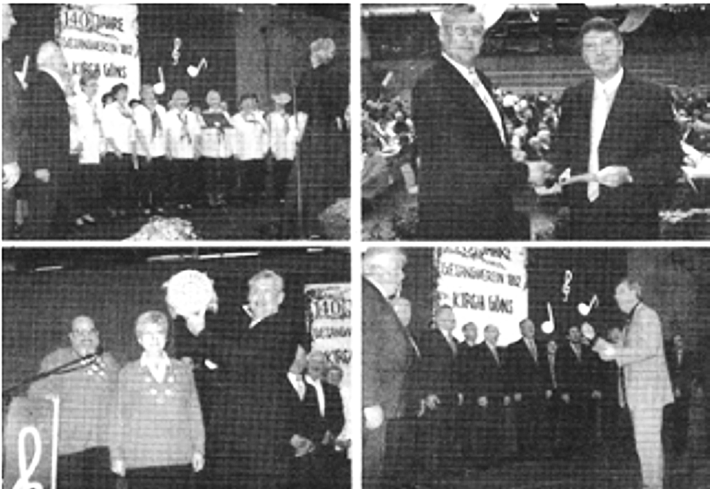 Der Gesangverein 1862 Kirch-Göns feierte am Samstagabend in der Mehrzweckhalle Kirch-/Pohl-Göns mit einem Liederabend sein 140-jähriges Bestehen. Unsere Bilder zeigen von oben links im Uhrzeigersinn: den gemischten Chor des Kirch-Gönser Jubilar-Vereins mit Dirigentin Daniela Schneider beim Auftritt, Bürgermeister Oswin Veith und Vereinsvorsitzender Peter B. Braasch bei der offiziellen Gratulation, die mit besonders viel Beifall bedachten Sangesfreunde „Kleebachtal“ Oberkleen mit ihrem Dirigenten Werner Bohm und Peter. B. Braasch, der den gerade von Paul Weißkopf und Brigitte Leiser als Geschenk des Jodel-Doppelquartetts Escher-Wyss erhaltenen Schweizer Käse stolz in die Höhe reckt.
