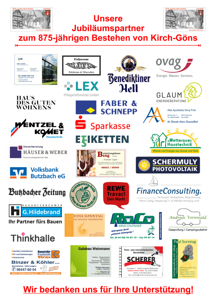 Bitte senden Sie uns die beigefügte Rückmeldung mit dem von Ihnen gewünschten Sponsoringpaket postalisch oder per E-Mail zurück. (Interessengemeinschaft Kirch-Gönser Vereine und Gruppierungen, Michael Tiedemann, Hauptstraße 33a, 35510 Butzbach/Kirch-Göns, Sponsoring@875jahrekirchgoens.de).